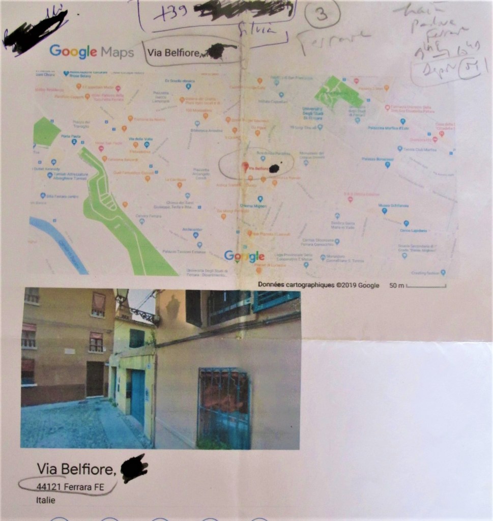Au carrefour suivant, il n’y avait plus que trois flèches, et une visiteuse, vue de très loin, qui ressemblait à Silvia, captant l’image d’une façade ( et à Ferrare, tout est façade?) mais j’eus ensuite l’impression que j’apercevais Silvia en des lieux divers. Ou bien ses semblables ? Je perdis la piste. Je me prétendis que ce serait pour plus tard, demain, une autre fois, peut-être pas du tout, après tout, la casa Bassani, ce n’est qu’une maison à devanture jaune fatiguée, mal préservée par les fleurs des balcons, le genre oublié.